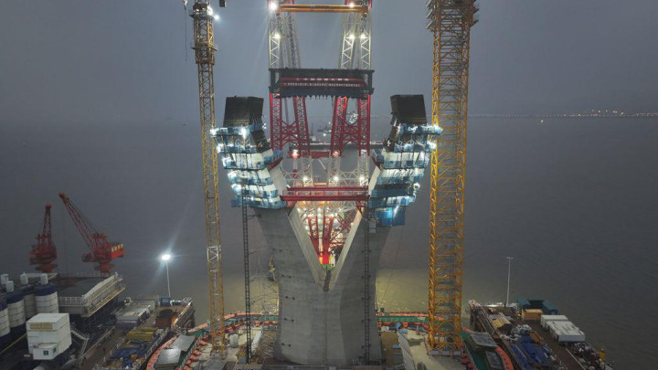 随着“铁建大桥起1号”起重船巨臂缓缓伸展,重达620吨的钢铁骨架被精准吊运至指定位置。2月23日,由中国铁建大桥局参与建设的青龙门大桥3号主塔下横梁完成百米高空“搭肩”,标志着大桥主体结构进入中上部施工阶段。